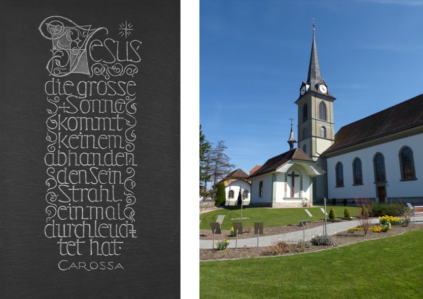 Das Kernstück des „Spirituellen Weges“ bilden die 30 meisterhaft bearbeiteten Steintafeln, die der Bildhauermeister und Künstler Cölestin Kilchoer der Pfarrei Düdingen geschenkt hat. Mit einer besonderen Ausdruckskraft zeigen sie biblische, christliche und weisheitliche Sprüche und Motive. Sie laden die Betrachtenden zur Besinnung und zur Auseinandersetzung mit dem eigenen Leben und Glauben ein. Nicht nur die Pfarrei Düdingen, sondern alle Besucherinnen und Besucher sind Herrn Kilchoer überaus dankbar für dieses unschätzbar wertvolle Geschenk. Denn sie sind nicht nur in künstlerischer und spiritueller Hinsicht Meisterwerke; auch vom Aufwand her sind sie sehr wertvoll, entspricht doch eine einzige Tafel der Arbeit einer ganzen Woche.